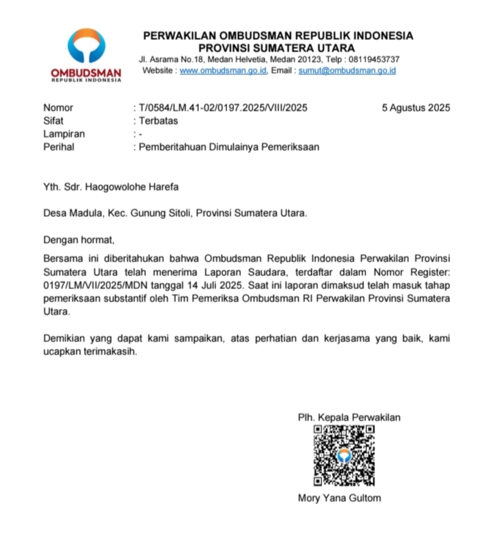 Dalam surat tersebut, Ombudsman menyatakan bahwa laporan dari pelapor Drs. Haogowolohe Harefa telah terdaftar dengan Nomor Register 0197/LM/VII/2025/MDN tanggal 14 Juli 2025. Saat ini, laporan tersebut sudah masuk tahap pemeriksaan substantif oleh Tim Pemeriksa Ombudsman RI Perwakilan Sumut.