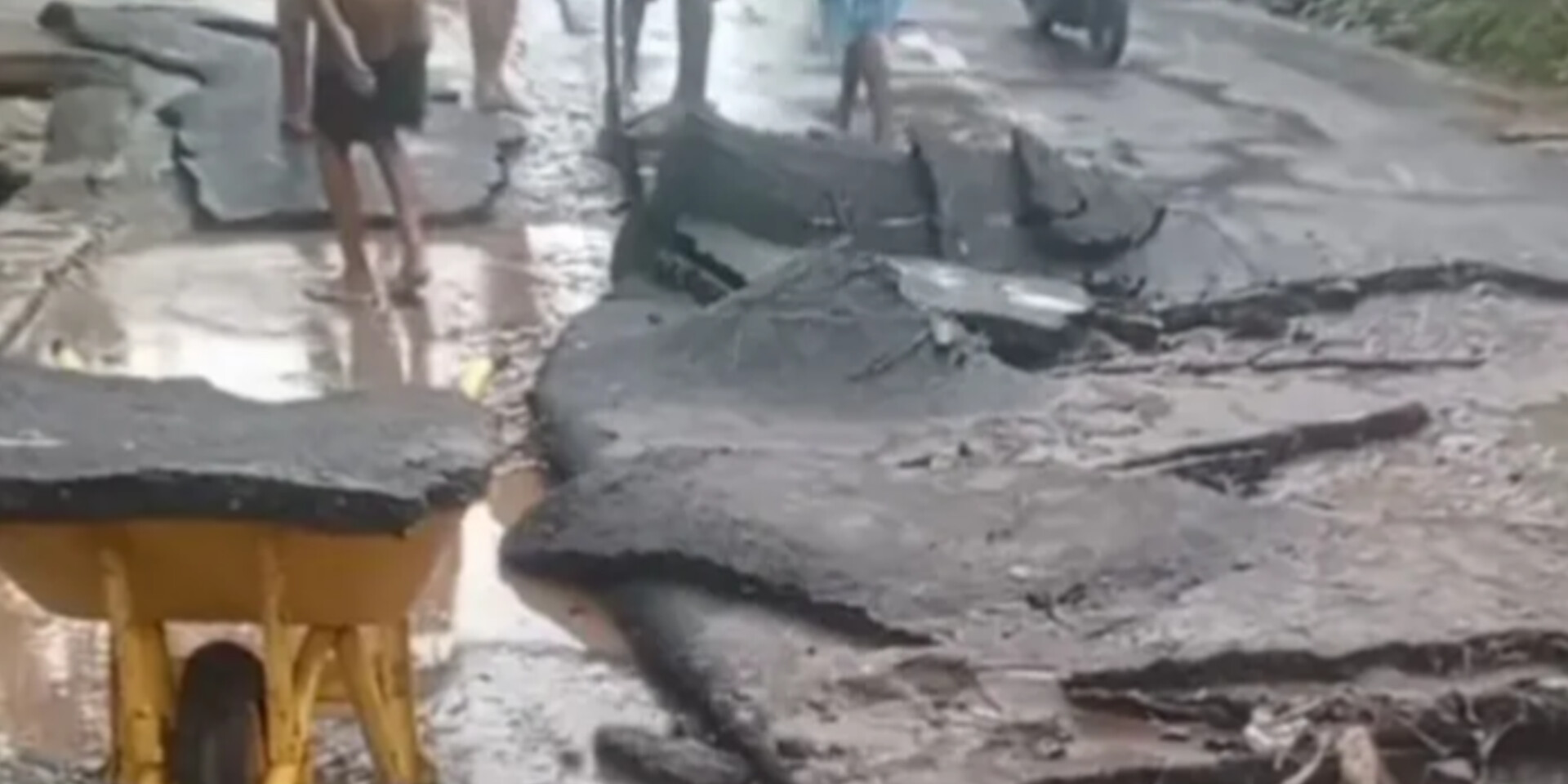 Penyebab Kerusakan: Diduga akibat kualitas aspal yang rendah sehingga tidak tahan terhadap limpasan air hujan.